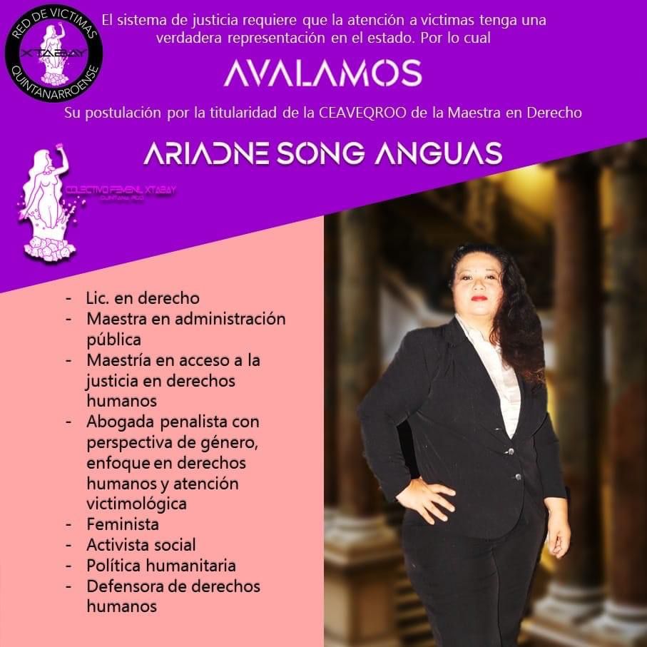 Asimismo se hizo mención que se propone como candidata a Ariadne Song integrante del Colectivo Femenil Xtabay Quintana Roo y la Red de Víctimas Quintanarroense.