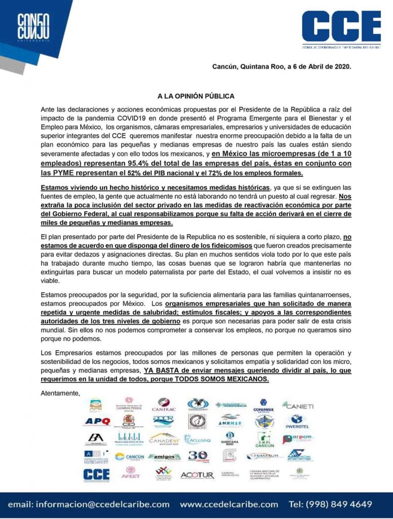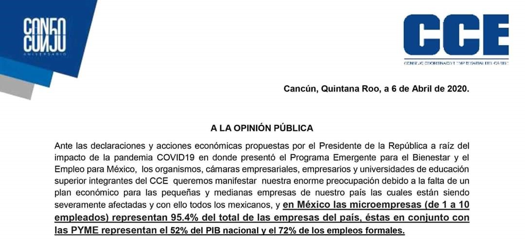 Cancún, Q. Roo, Lunes 06 de Abril de 2020, poderycrítica.- Para el Consejo Coordinador Empresarial del Caribe (CCE), el Plan Económico presentado por el Presidente de la República no contempla apoyos para la micro y pequeña empresa ni es sostenible para afrontar la crisis que generará la pandemia del Covid-19.