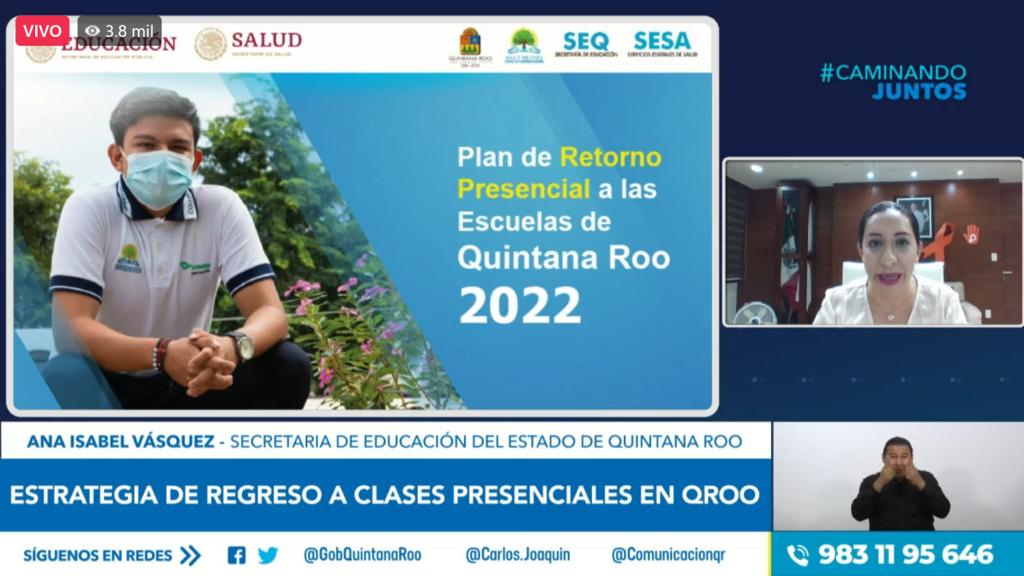 PODER Y CRÍTICA | REDACCIÓN | La titular de la Secretaría de Educación de Quintana Roo (SEQ), Ana Isabel Vásquez Jiménez, informó que el 31 de enero se regresará a clases presenciales en educación media superior y superior, en tanto que el 14 de febrero lo harán las escuelas de educación básica, de acuerdo al “Plan de Retorno Presencial a las Escuelas de Quintana Roo 2022”.