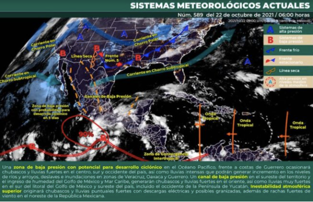 Por otra parte, un canal de baja presión extendido sobre el sureste del territorio y el ingreso de humedad del Golfo de México y Mar Caribe, generarán chubascos y lluvias puntuales fuertes en el oriente, así como lluvias puntuales muy fuertes en el sur del litoral del Golfo de México y sureste del país, incluido el occidente de la Península de Yucatán.