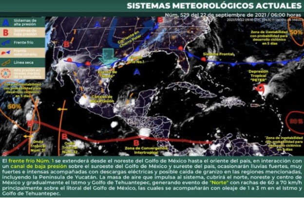 Chetumal, Q. Roo, miércoles 22 de septiembre de 2021, poderycrítica.- El Servicio Meteorológico Nacional informó que se mantiene la entrada de aire marítimo tropical procedente del mar Caribe con poco contenido de humedad, hacia la península de Yucatán; generando nubosidad variable, con probabilidades de lluvias ocasionales aisladas, así como, algunos chubascos, temperaturas muy caluroso a calurosas, viento fresco y arrachado del sureste variando al este, sobre la península de Yucatán y del estado de Quintana Roo, principalmente después de mediodía.