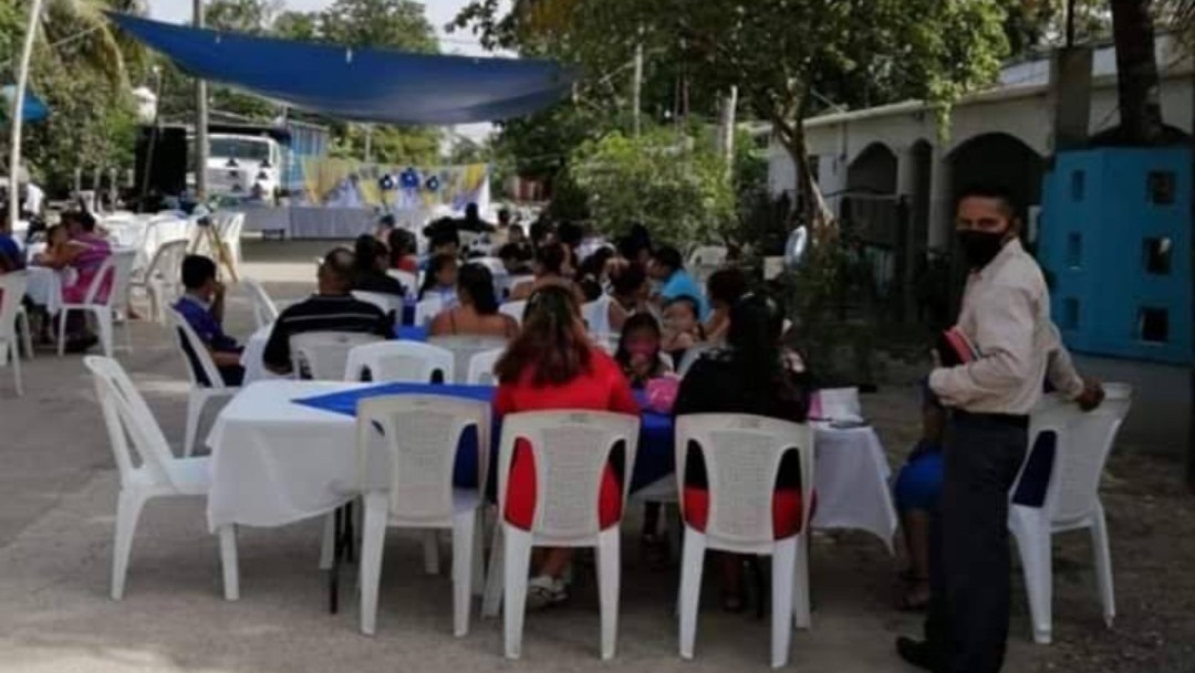 En vía pública colocaron calles y mesas para recibir a cerca de 50 personas, de las cuales muy pocas portaban cubrebocas.