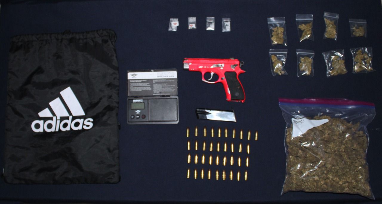 Los sujetos tenían en su posesión 8 bolsas pequeñas y 1 bolsa grande con vegetal verde y seco similar a la mariguana, 4 bolsas con polvo blanco al parecer cocaína, un arma de fuego, 37 cartuchos calibre 9 milímetros y 1 báscula gramera.