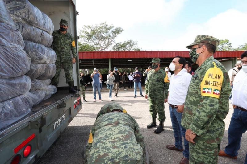 Ante las limitantes que propicia la distribución de todos estos insumos y materiales, Vila Dosal ofreció el apoyo de su Gobierno, por lo que a través de Procivy se otorgará apoyo con 3 montacargas y si es necesario, se pondrá a disposición de la Sedena un tráiler para distribuir estos materiales de forma rápida y eficiente.