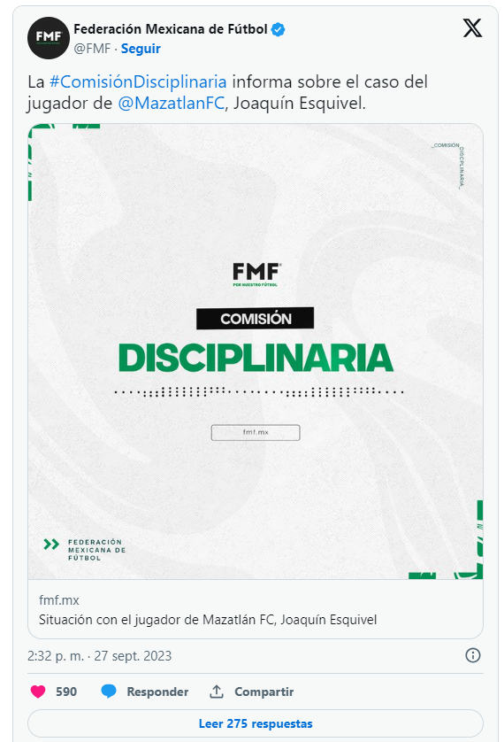 De esta manera, se notificó que, Joaquín Esquivel cumplirá con su partido de suspensión en la jornada 10 del torneo Apertura 2023, pero el conjunto del Mazatlán FC conservará su victoria de 3-1 obtenida sobre Chivas en el Estadio Akron en el adelantado de la jornada 11.