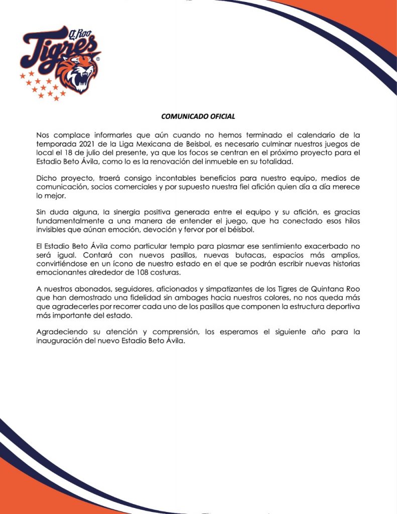 Cancún, Q. Roo, miércoles 14 de julio de 2021, poderycrítica.- Nos complace informarles que aun cuando no hemos terminado el calendario de la temporada 2021 de la Liga Mexicana de Béisbol, es necesario culminar nuestros juegos de local el 18 de julio del presente, ya que los focos se centran en el próximo proyecto para el Estadio Beto Ávila, como lo es la renovación del inmueble en su totalidad.