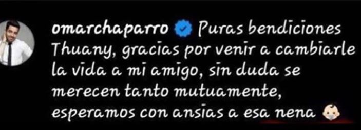 Pero el que más destacó de todos los comentarios fue el de su amigo Omar Chaparro, en donde les manda bendiciones y por un descuido aparentemente revela que sera una niña el bebe que está esperando la pareja.