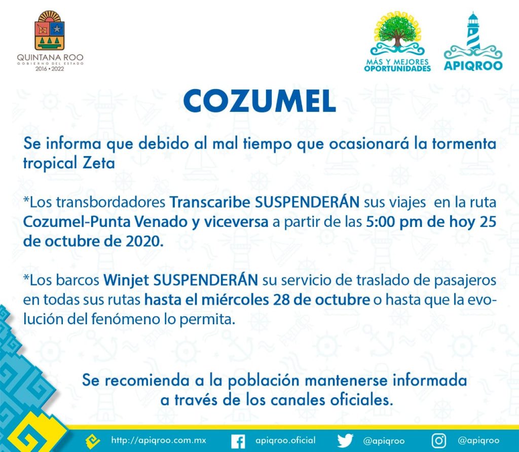 Cozumel, Q. Roo, Domingo 25 de Octubre del 2020, poderycrítica.- La Apiqroo informa que debido al mal tiempo que ocasionará la tormenta tropical «Zeta», los transbordadores Transcaribe suspenderán sus viajes en la ruta Cozumel-Playa del Carmen y viceversa a partir de las 5:00 PM de hoy 25 de octubre.