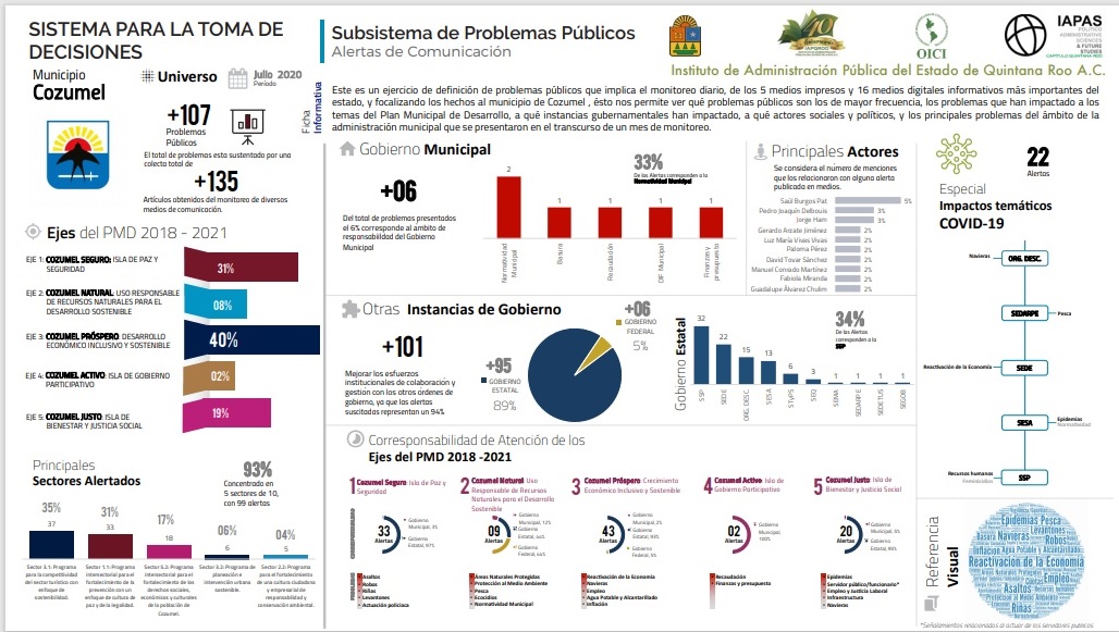 “Este es un ejercicio de definición de problemas públicos que implica el monitoreo diario de los 5 medios impresos y 16 medios digitales informativos más importantes del estado y focalizando los hechos al municipio de Cozumel; esto nos permite ver qué problemas públicos son los de mayor frecuencia, los problemas que han impactado a los temas del Plan Municipal de Desarrollo, a qué instancias gubernamentales han impactado, a qué actores sociales y políticos, y los principales problemas del ámbito de la administración municipal que se presentaron en el transcurso de un mes de monitoreo”, que en este caso fue julio, detalla el documento.