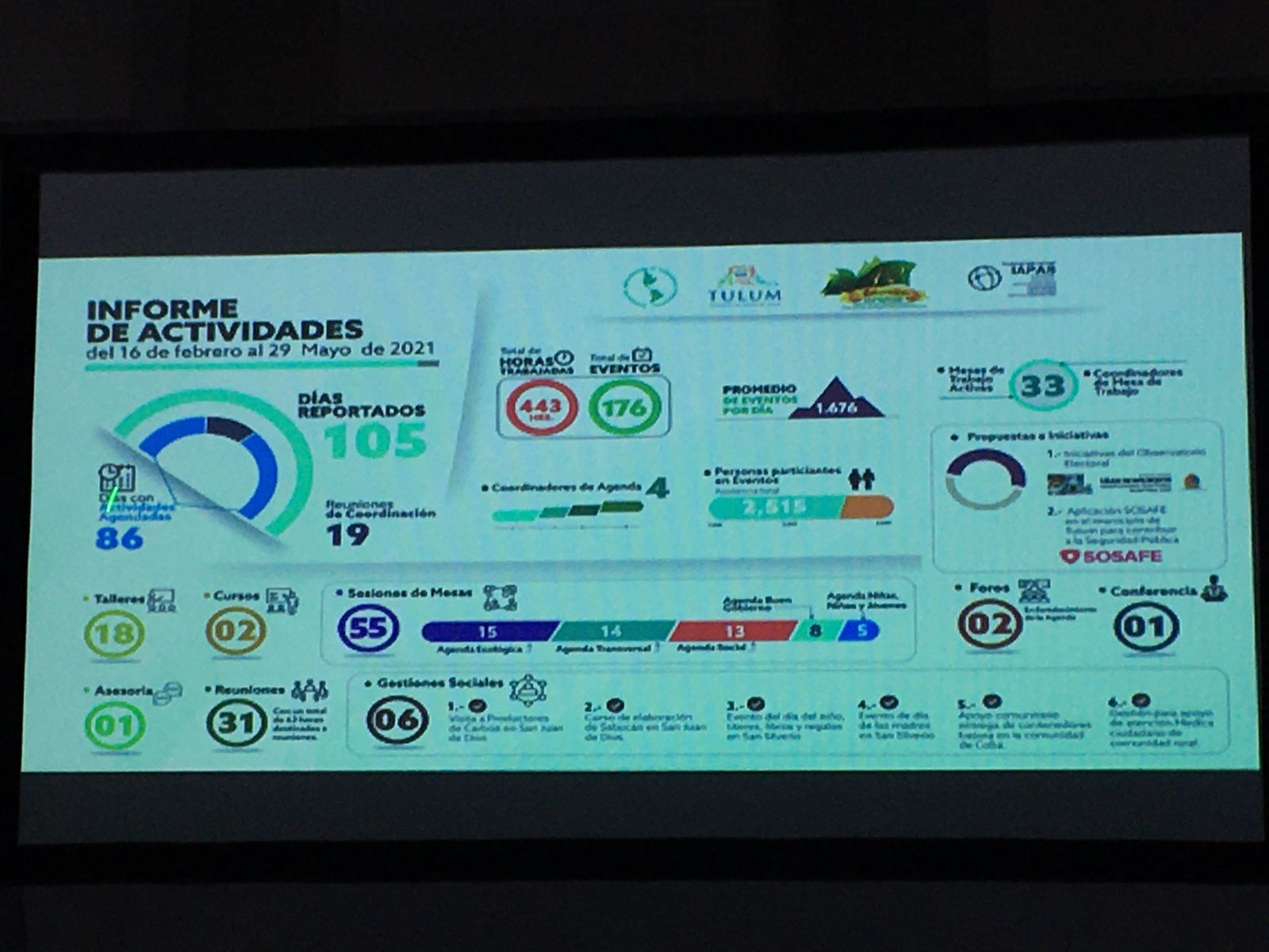 En la presentación del Informe de la Agenda Ciudadana por el Desarrollo Sustentable de Tulum, por parte de León Lizárraga Cubedo habló sobre los problemas del Municipio que fueron recabados en cada comunidad desde el 16 de febrero hasta el 29 de mayo, donde trabajaron 105 días y realizaron 176 eventos, con cinco eventos por día aproximadamente.
