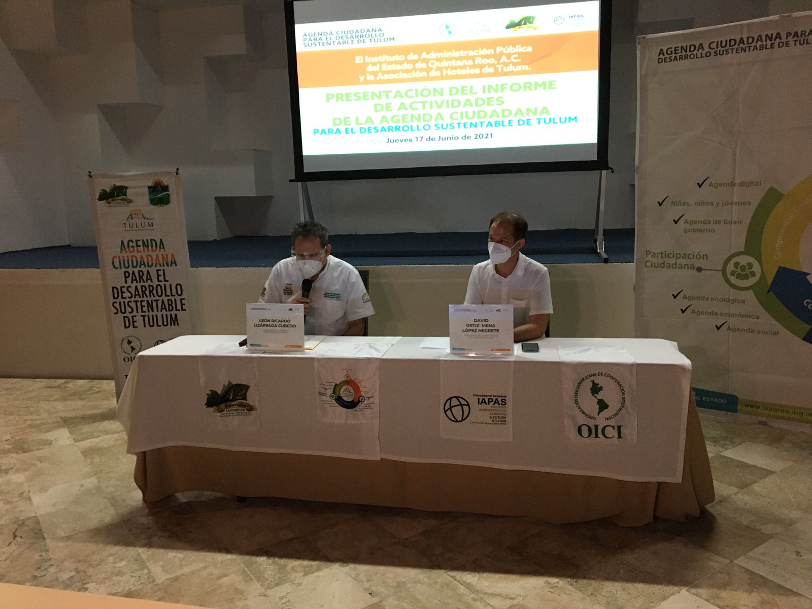 Tulum, Q. Roo, Jueves 17 de Junio de 2021, poderycrítica.- La Asociación de Hoteles de Tulum que preside David Ortiz Mena y el Instituto de Administración Pública de Quintana Roo, que tiene a su cargo León Lizárraga Cubedo, presentaron hoy las conclusiones de la construcción de la Agenda Ciudadana para el Desarrollo Sustentable de Tulum (ACDST), donde destacó que los gastos que originó el proyecto son por cuenta de las dos AC.