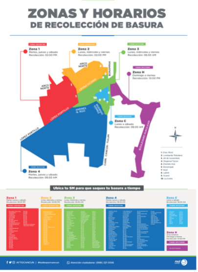 La Zona C, conformada por las colonias Arrecifes, Caribe, Kaan Chac, Las Mañanitas, Lilas, Princess y las Supermanzanas 1 a 3, 2a, 20, 22, 23, 25 a 30 y 35, será recorrida de lunes a sábado en el horario matutino. Finalmente, en horario nocturno a partir de las 22:00 horas, de domingo a viernes se ofrecerá atención en la Zona H, que abarca el Bulevar Kukulcán.