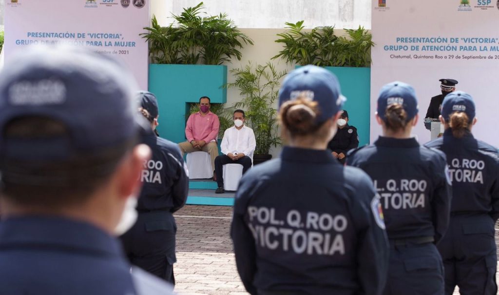 Chetumal, Q. Roo, miércoles 29 de septiembre de 2021, poderycrítica.- Fue presentado el grupo femenil denominado “Victoria” que estará conformado por 30 elementos que estarán enfocadas para atender emergencias de mujeres violentadas o en estado de riesgo. Este grupo tiene capacitación en derechos humanos, protección a periodistas, contención emocional, perspectiva de género, igualdad, prevención de acoso sexual, lenguaje incluyente, así como todo tipo de violencia en contra mujeres quintanarroenses.