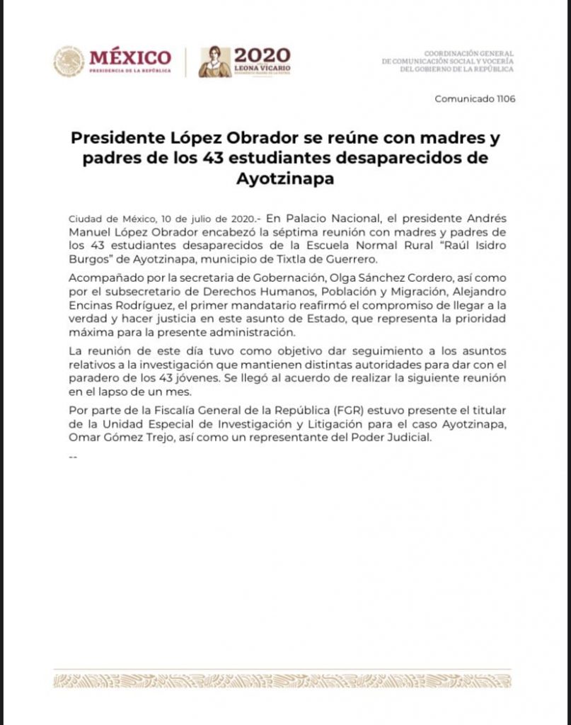 Ciudad de México, Viernes 10 de Julio de 2020, poderycrítica.- En Palacio Nacional, el presidente Andrés Manuel López Obrador encabezó la séptima reunión con madres y padres de los 43 estudiantes desaparecidos de la Escuela Normal Rural “Raúl Isidro Burgos” de Ayotzinapa, municipio de Tixtla de Guerrero.
