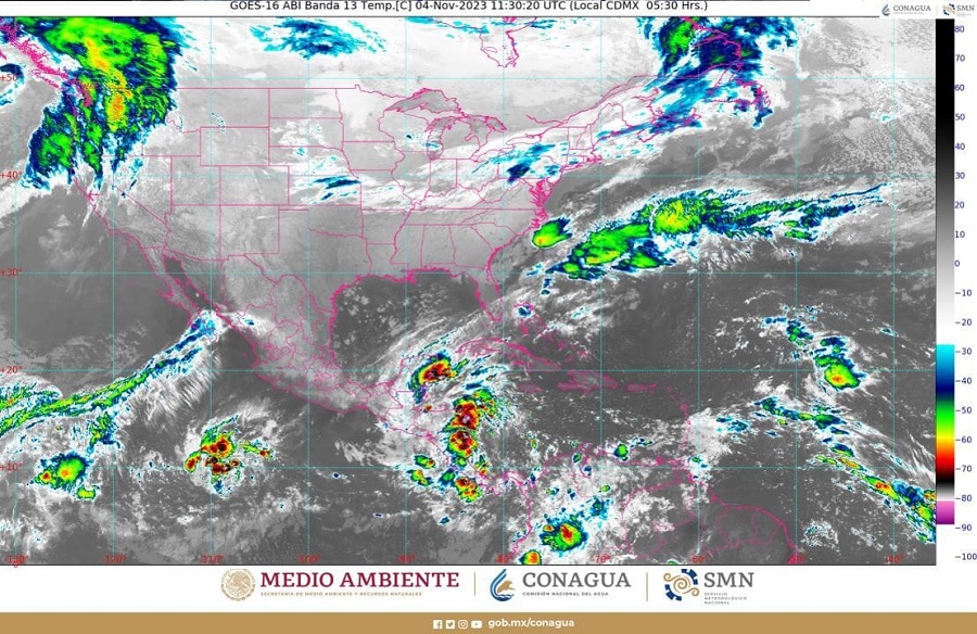 Hoy, el sistema frontal núm. 8 continuará afectando el norte de la Península de Yucatán, interaccionará con las extensas bandas nubosas de la zona de baja presión con potencial ciclónico, la cual se localiza frente a las costas de Nicaragua y con un canal de baja presión al sureste del país, ocasionarán lluvias puntuales intensas en Veracruz (sur), Oaxaca, Chiapas, Tabasco y Quintana Roo, muy fuertes en Campeche y fuertes en Yucatán. La masa de aire frío asociada al frente, seguirá generando evento de “Norte” muy fuerte con oleaje elevado en el Istmo y Golfo de Tehuantepec, y fuerte en Veracruz (sur), Tabasco y en la Península de Yucatán. Asimismo, seguirá ocasionando bancos de niebla y ambiente frío al amanecer en zonas altas de los estados del noreste, oriente, centro y sureste del país.