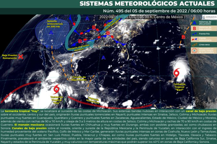 Un canal de baja presión prevalecerá sobre el noreste, oriente y sureste de la República Mexicana y en interacción con la proximidad de un frente frío sobre la frontera noreste del país y con el ingreso de humedad proveniente del océano Pacífico y Golfo de México, ocasionarán lluvias fuertes a muy fuertes en las regiones mencionadas, con lluvias puntuales intensas en zonas de Coahuila, Nuevo León y Tamaulipas.