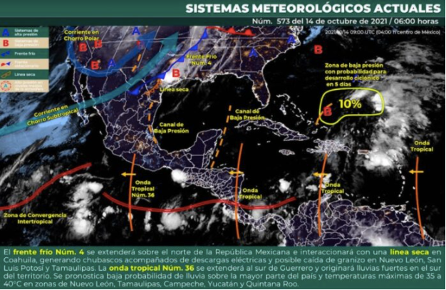 El SMN mantiene vigilancia sobre una Zona de baja presión que tiene el 10% de probabilidad para desarrollo ciclónico en 48 horas y en cinco. Se localiza aproximadamente a 1 mil 940 kilómetros al este-noreste de las costas de Quintana Roo, con desplazamiento hacia el este.