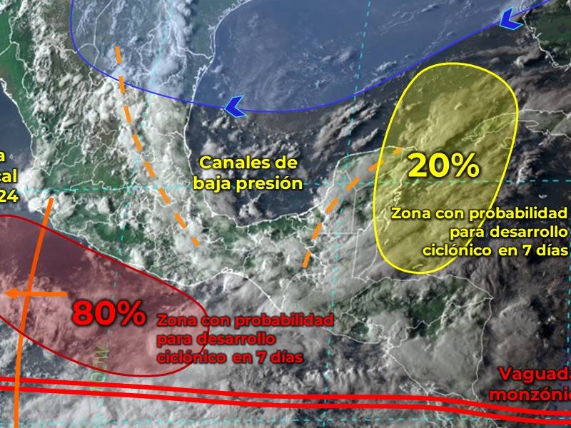 Una zona de inestabilidad con probabilidad de desarrollo ciclónico se localizará al sur de las costas de Guerrero y propiciará lluvias muy fuertes a puntuales intensas en Guerrero y Oaxaca. Finalmente, prevalecerá ambiente muy caluroso a extremadamente caluroso sobre el noroeste del territorio nacional, con temperaturas máximas superiores a los 40 °C en Baja California, Sonora y Sinaloa.