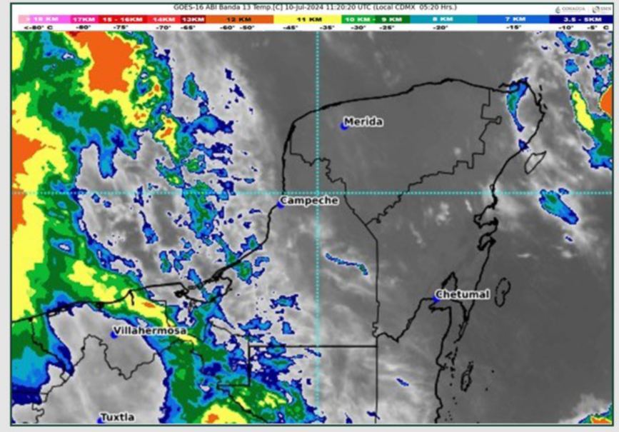 PODER Y CRÍTICA | REDACCIÓN | Para este miércoles 10 de julio, el Servicio Meteorológico Nacional (SMN) pronostica cielo medio nublado durante la mañana y ambiente templado. Por la tarde, cielo nublado con chubascos acompañadas de descargas eléctricas en Campeche, Yucatán y Quintana Roo. En la tarde, ambiente cálido a caluroso en la región.