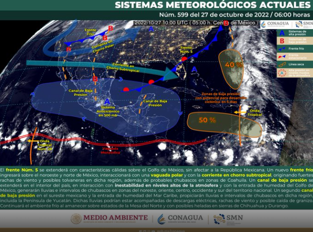 El frente Núm. 5 se extenderá con características cálidas sobre el Golfo de México, sin afectar a la República Mexicana. Por otra parte, un nuevo frente frío ingresará sobre el noroeste y norte de México, interaccionará con una vaguada polar y con la corriente en chorro subtropical, originando fuertes rachas de viento y posibles tolvaneras en dicha región, además de probables chubascos en zonas de Coahuila.
