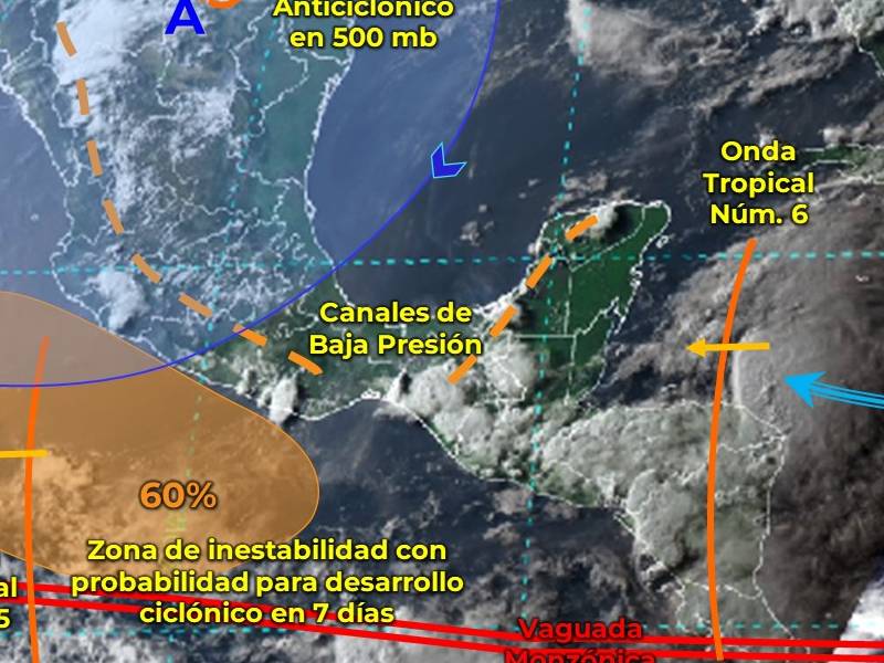 La corriente en chorro subtropical en el noroeste del país, una línea seca en el noreste de México, canales de baja presión en el norte, occidente, oriente, sureste, incluida la Península de Yucatán, la onda tropical Núm. 6 que se desplazará al sur de la Península de Yucatán.