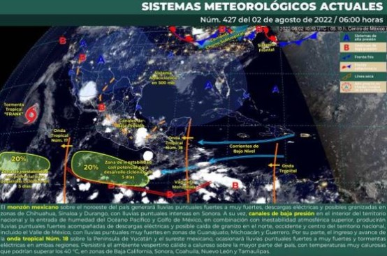 Por su parte, el ingreso y avance de la onda tropical Núm. 18 sobre la Península de Yucatán y el sureste mexicano, ocasionará lluvias puntuales fuertes a muy fuertes y tormentas eléctricas en ambas regiones.