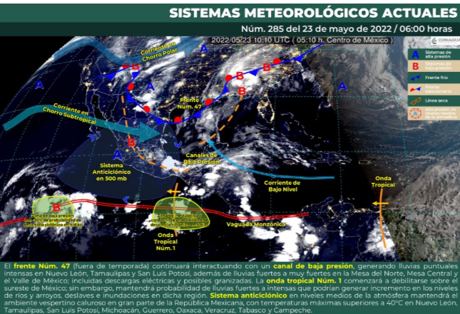 Por otro lado, La onda tropical Núm. 1 comenzará a debilitarse sobre el sureste de México; sin embargo, mantendrá probabilidad de lluvias fuertes a intensas que podrían generar incremento en los niveles de ríos y arroyos, deslaves e inundaciones en dicha región.