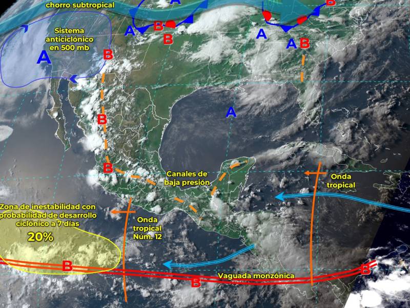 Para hoy sábado, el monzón mexicano continuará establecido sobre el noroeste del país y la onda tropical Núm. 12 que se desplazará al suroeste de las costas de Colima y Jalisco, generarán lluvias muy fuertes en Sonora, Chihuahua, Sinaloa y Durango, lluvias fuertes en Nayarit y Jalisco, así como lluvias con chubascos en el resto del occidente y noroeste de México. Por otra parte, canales de baja presión extendidos sobre el interior y el sureste del territorio nacional, en combinación con el ingreso de humedad de ambos litorales, ocasionarán lluvias fuertes en Veracruz, Guerrero y Oaxaca, además de lluvias y chubascos en el noreste, centro y el resto del sureste del territorio nacional, así como en el Valle de México. Asimismo, se mantendrá el ambiente muy caluroso a extremadamente caluroso con temperaturas máximas superiores a 40 °C sobre estados del noroeste, norte y noreste de México, además del oriente del país y la Península de Yucatán. Finalmente, una nueva onda tropical se aproximará a la Península de Yucatán, propiciando intervalos de chubascos en dicha península.