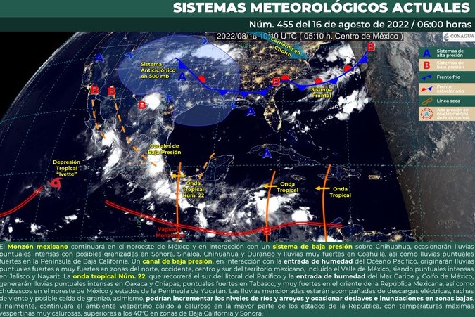 Por otro lado, la onda tropical Núm. 22, que recorrerá el sur del litoral del Pacífico y la entrada de humedad del Mar Caribe y Golfo de México, generarán lluvias puntuales intensas en Oaxaca y Chiapas, puntuales fuertes en Tabasco, a muy fuertes en el oriente de la República Mexicana, así como chubascos en el noreste de México y estados de la Península de Yucatán.
