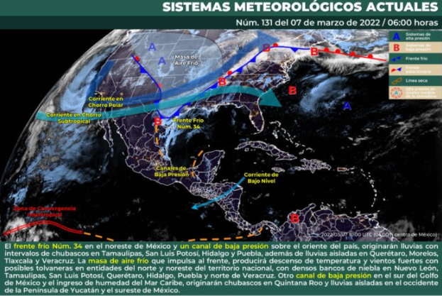 Así mismo, el SMN agregó que para hoy, el frente frío Núm. 34 se desplazará sobre el noreste de México y un canal de baja presión se ubicará sobre el oriente del territorio, lo que originará lluvias con intervalos de chubascos en Tamaulipas, San Luis Potosí, Hidalgo y Puebla, además de lluvias aisladas en Querétaro, Morelos, Tlaxcala y Veracruz.