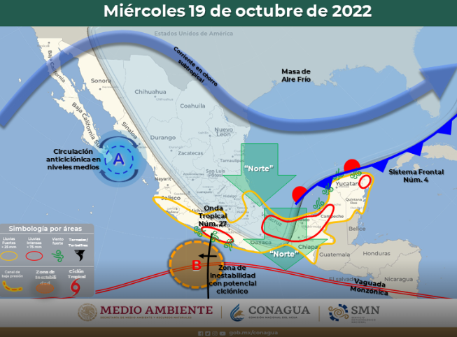 De acuerdo con el Boletín Meteorológico que elabora la dependencia, el tiempo probable para el estado de Quintana Roo será mayormente nublado, lluvias con chubascos acompañados de actividad eléctrica, viento fresco del norte y del noroeste de 20 a 30 kilómetros por hora, con rachas mayores, mientras que en Cozumel sería de 25 a 35 kph y en José María Morelos, de 15 a 25 kph, con rachas mayores.