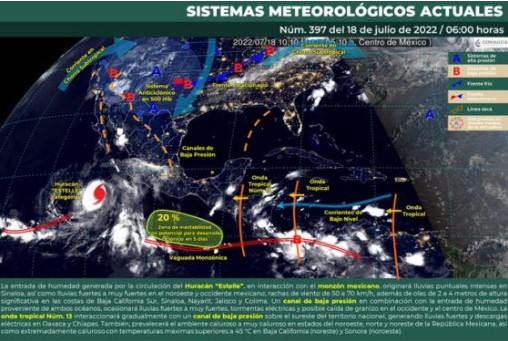 Finalmente, prevalecerá el ambiente caluroso a muy caluroso en estados del noroeste, norte y noreste de la República Mexicana, así como Poder y extremadamente caluroso con temperaturas máximas superiores a 45 °C en Baja California (noreste) y Sonora (noroeste).