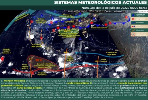 Al mismo tiempo, la onda tropical Núm. 11 recorrerá el sureste del país e interaccionará con una zona de baja presión con potencial ciclónico ubicada frente a la costa occidental de Costa Rica, originarán lluvias fuertes a muy fuertes acompañadas de descargas eléctricas y posible caída de granizo en dicha región.