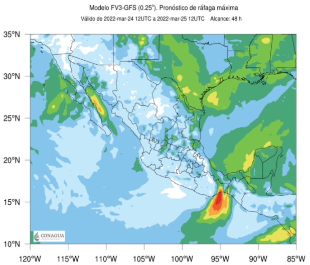 Asimismo, continuará el evento de “Norte” fuerte a muy fuerte durante la mañana en el sur del litoral del Golfo de México, la Península de Yucatán e Istmo y Golfo de Tehuantepec, disminuyendo de intensidad en el transcurso de la tarde.