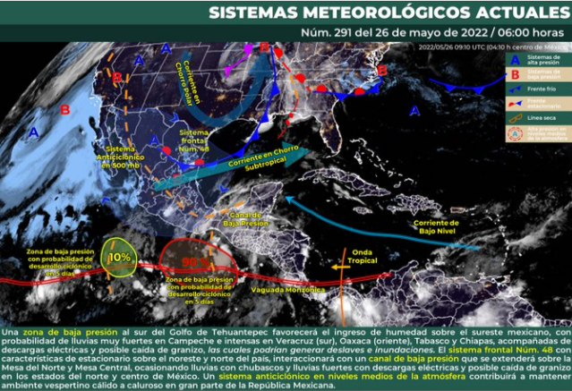 Una zona de baja presión incrementará su probabilidad de desarrollo ciclónico al sur del Golfo de Tehuantepec y favorecerá el ingreso de humedad sobre el sureste mexicano, con probabilidad de lluvias puntuales muy fuertes en Campeche e intensas en Veracruz (sur), Oaxaca (oriente), Tabasco y Chiapas, acompañadas de descargas eléctricas y posible caída de granizo, las cuales podrían generar deslaves e inundaciones.