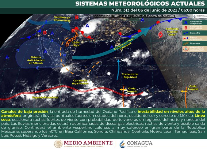 Este día, canales de baja presión en el interior y sureste del país, la entrada de humedad del Océano Pacífico e inestabilidad en niveles altos de la atmósfera, originarán lluvias puntuales fuertes en estados del norte, occidente, sur y sureste del territorio mexicano.