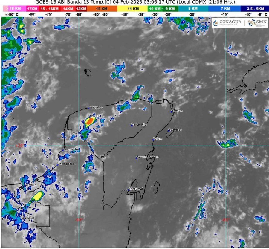 Para la Península de Yucatán, cielo medio nublado en el transcurso del día, con chubascos en Campeche y Quintana Roo, así como lluvias aisladas en Yucatán. Ambiente fresco por la mañana y cálido a caluroso por la tarde.