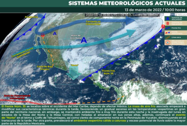 Agrega que un nuevo frente frío se extenderá sobre la frontera norte de México, interaccionará con una línea seca sobre dicha región, ocasionando vientos fuertes con rachas de 60 a 70 km/h y tolvaneras en Chihuahua y Coahuila.