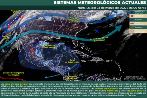 Finalmente, en horas de la noche un nuevo frente frío y una vaguada polar se aproximarán al norte de la Península de Baja California y producirán intervalos de chubascos en el norte de dicha entidad con probabilidad para la caída de nieve o aguanieve en sus zonas serranas, así como lluvias aisladas en Sonora.