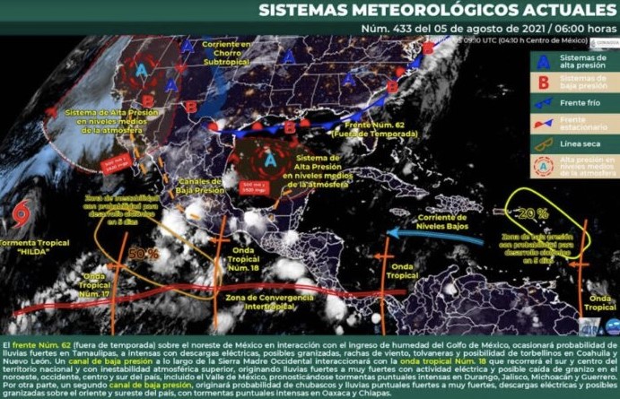 Asimismo, un canal de baja presión se extenderá a lo largo de la Sierra Madre Occidental e interaccionará con el paso de la onda tropical Núm. 18 que recorrerá el sur y centro del territorio nacional y con inestabilidad atmosférica superior, originando probabilidad de lluvias fuertes a muy fuertes con actividad eléctrica y posible caída de granizo en el noroeste, occidente, centro y sur del país, incluido el Valle de México, pronosticándose tormentas puntuales intensas en Durango, Jalisco, Michoacán y Guerrero.