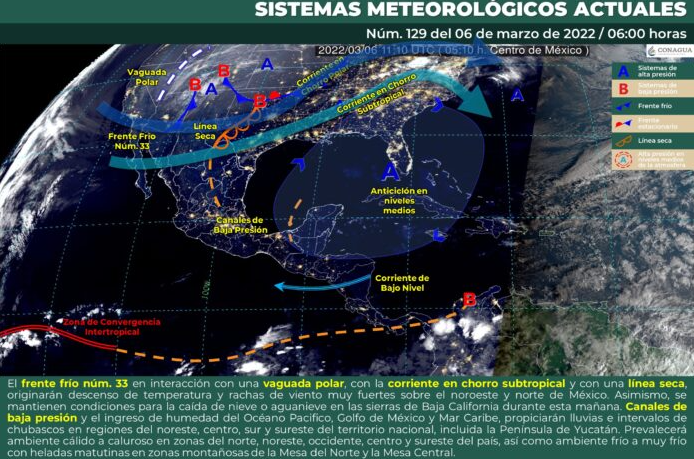 Lo anterior fue anunciado por el Servicio Meteorológico Nacional (SMN) y agrega que durante este día, el Frente Frío núm. 33 recorrerá el noroeste y norte de México, asociado con una vaguada polar y con la corriente en chorro subtropical, en interacción con una línea seca sobre Coahuila, originará descenso de temperatura y rachas muy fuertes de viento en dichas regiones.