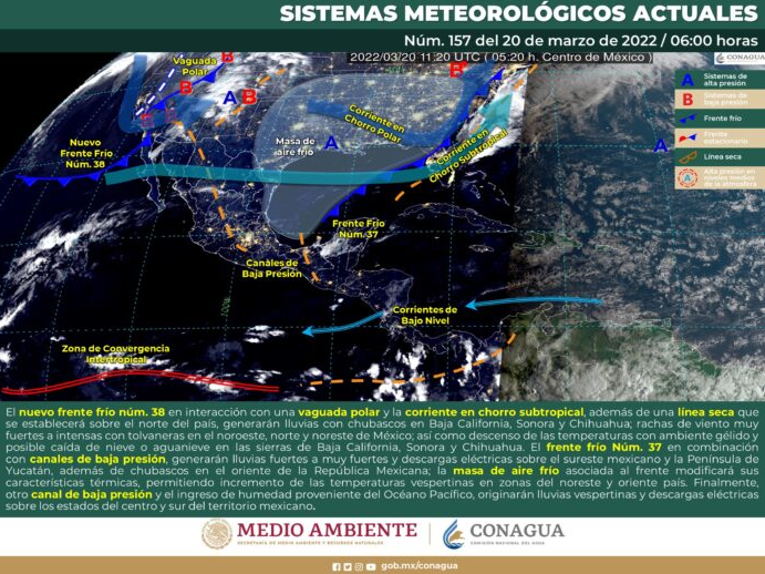 Por otro lado, el nuevo frente frío núm. 38 recorrerá el noroeste de México, en interacción con una vaguada polar y la corriente en chorro subtropical que cruzan dicha región, además de una línea seca que se establecerá sobre el norte del país, generarán lluvias con chubascos en Baja California, Sonora y Chihuahua.