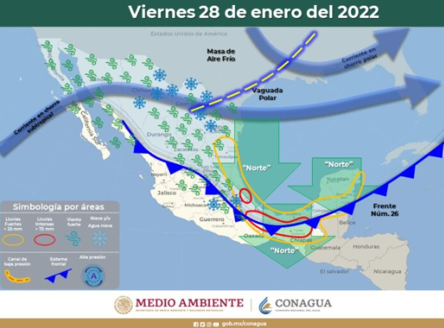 Por otro lado, el nuevo frente frío No. 26 se desplazará rápidamente sobre el noreste, oriente y sureste mexicano en el transcurso del día, generará lluvias intensas a puntuales torrenciales que podrían incremento los niveles de ríos y arroyos, deslaves e inundaciones en zonas de Puebla (sierra y norte), Veracruz, Oaxaca (norte y oriente), Chiapas (norte) y Tabasco (sur), así como chubascos y lluvias fuertes en estados del norte y centro del país.