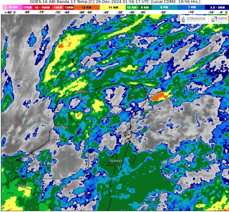 Para la Península de Yucatán anuncian cielo medio nublado a nublado durante el día, con chubascos en Campeche y Yucatán. Durante la mañana, ambiente fresco a templado. Por la tarde, ambiente cálido.