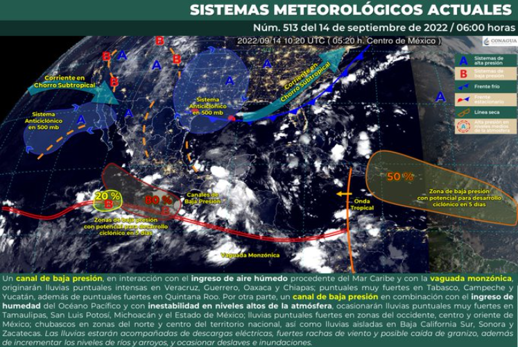 Así mismo, un canal de baja presión sobre el suroeste del Golfo de México y el sureste del país, en interacción con la vaguada monzónica y una zona de baja presión con probabilidad para desarrollo ciclónico frente a la costa de Guerrero, aunado al ingreso de humedad del Mar Caribe, producirán lluvias fuertes a muy fuertes en el oriente, sur y sureste de la República Mexicana, incluida la Península de Yucatán, así como lluvias puntuales intensas en zonas de Guerrero, Oaxaca, Chiapas y Veracruz.