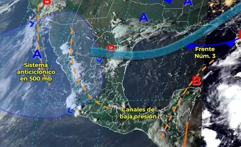 Finalmente, la circulación anticiclónica en niveles medios de la atmósfera prevalecerá sobre el noroeste del país, generando temperaturas máximas de 40 a 45 °C en zonas de Baja California, Sonora y Sinaloa.