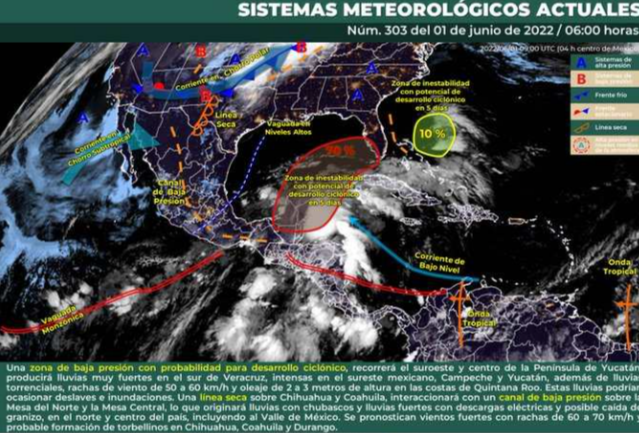 Una zona de baja presión con probabilidad para desarrollo ciclónico, asociada con los remanentes de “Agatha”, recorrerá el suroeste y centro de la Península de Yucatán. La nubosidad asociada producirá lluvias muy fuertes en el sur de Veracruz, intensas en el sureste mexicano.