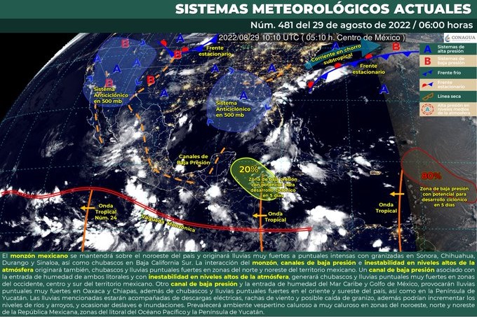 Un canal de baja presión en el sureste de México, asociado con la entrada de humedad del Mar Caribe y Golfo de México, provocarán chubascos y lluvias puntuales fuertes en el oriente, sureste y la Península de Yucatán, así como lluvias puntuales muy fuertes en Oaxaca y Chiapas. Las lluvias anteriormente mencionadas, estarán acompañadas de descargas eléctricas, rachas de viento y posible caída de granizo.