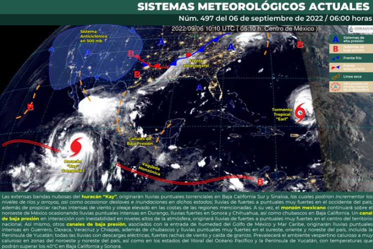 Canales de baja presión en el sureste y noreste de la República Mexicana, asociados con la entrada de humedad del Golfo de México y Mar Caribe, originarán lluvias puntuales intensas en Guerrero, Oaxaca, Veracruz y Chiapas, además de chubascos y lluvias puntuales muy fuertes en el sureste, oriente y noreste del país, incluida la Península de Yucatán; todas las lluvias con descargas eléctricas, fuertes rachas de viento y caída de granizo.