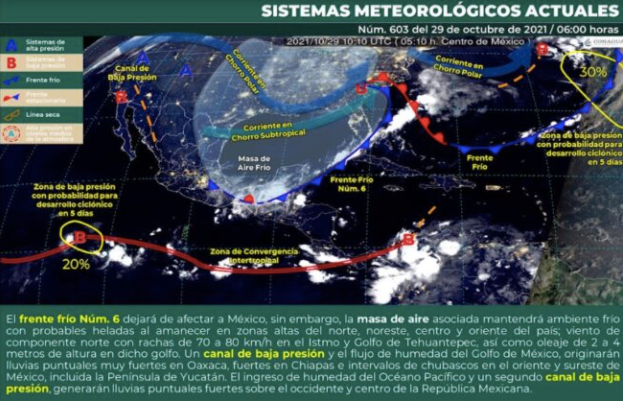 Chetumal, Q. Roo, viernes 29 de Octubre de 2021, poderycrítica.- El frente frío Núm. 6 se extenderá sobre el Mar Caribe y dejará de afectar a México, sin embargo, la masa de aire asociada mantendrá ambiente frío con probables heladas al amanecer en zonas altas del norte, noreste, centro y oriente del país.
